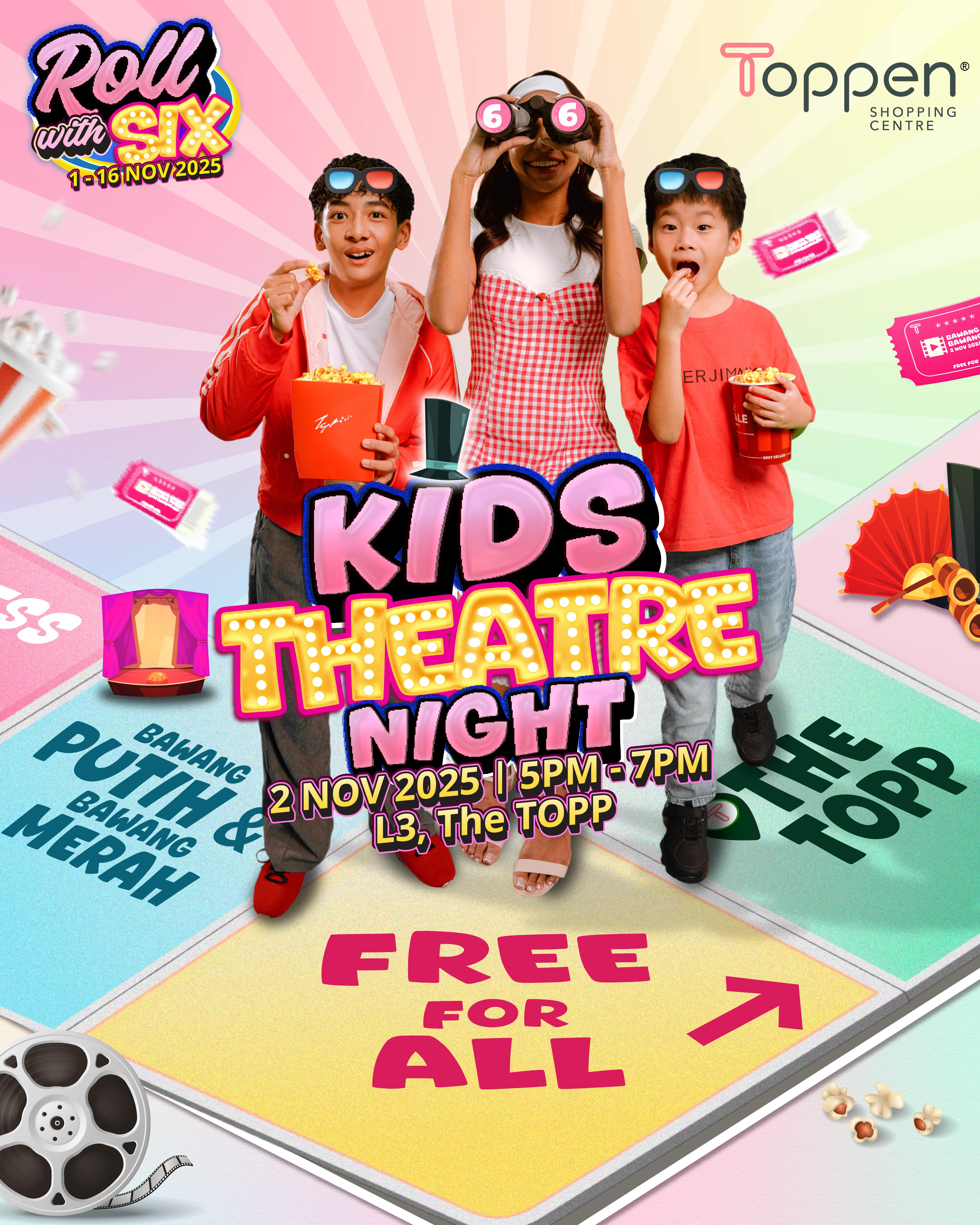 Kick off Toppen’s 6th Anniversary with a magical evening of storytelling, laughter, and family fun at Kids Theatre Night, featuring the timeless folktale Bawang Putih & Bawang Merah! 🌙✨