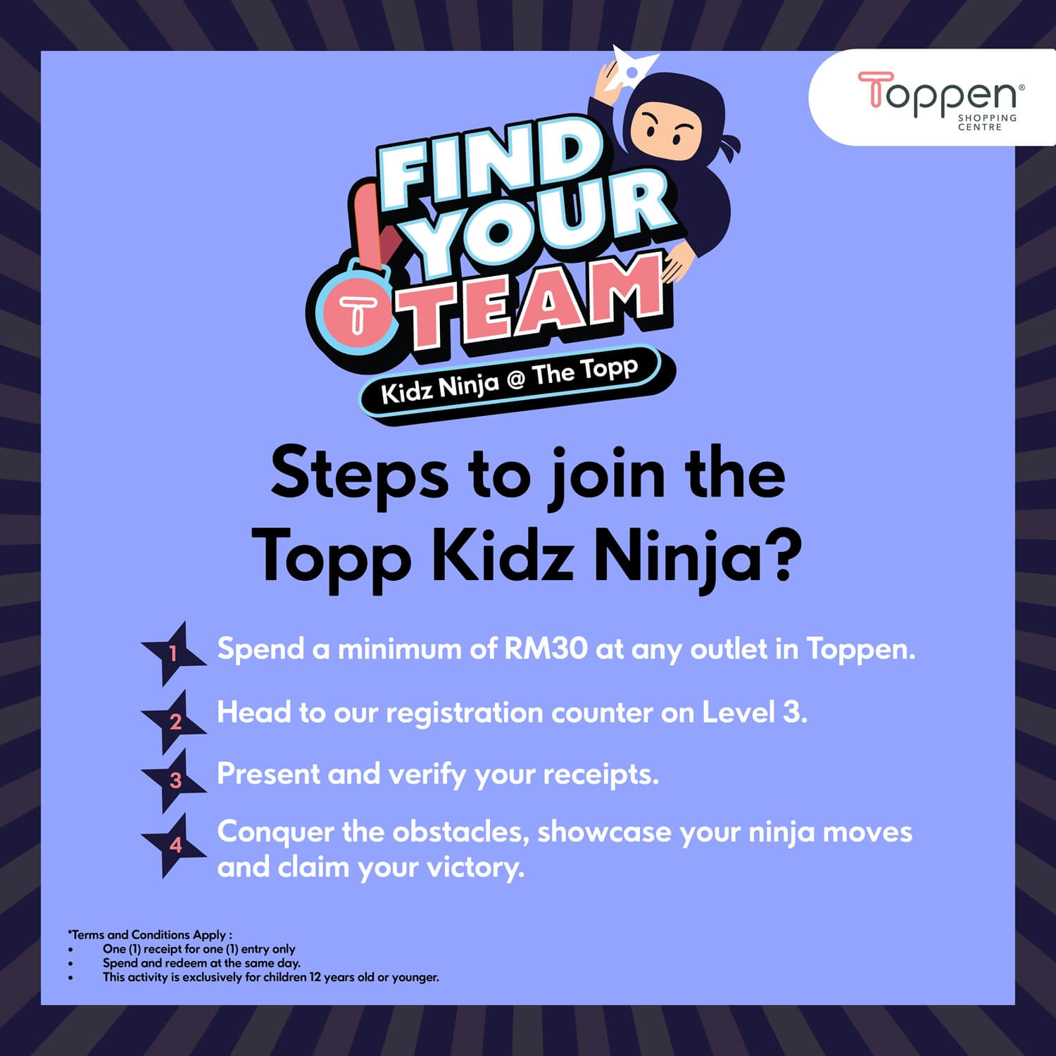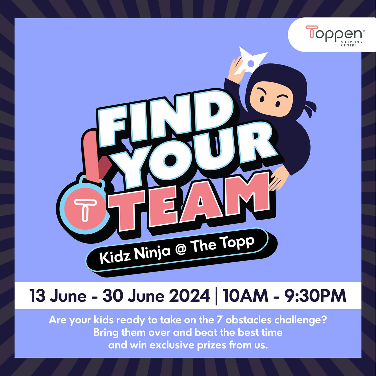 Hey there, little ninjas! Get ready for the ultimate challenge at the Kidz Ninja Challenge in Toppen ๐! Show off your ninja skills, conquer all obstacles, and win special prizes. Plus, top performers advance to the ‘Ninja Final Round’ every Saturday. Are you ready to become Toppen One Team, Kidz Ninja? We’ll shortlist the top 4 performers from Sunday to Wednesday, who complete the challenge in the shortest time, to win a prize: IKEA Special Gift & Medal.