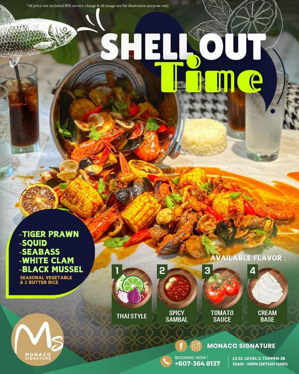 Nikmati hidangan seafood yang penuh rasa dan keseronokan makan bersama! Hidangan Shell Out kami dimuatkan dengan pelbagai pilihan laut segar yang pasti memikat selera.